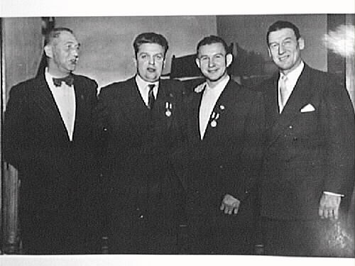 Titel: Fyra bandycharmörer,1930 talets. S.Lindberg, P.Franzen i mitten J.Gustavsson, Olle Sääv.