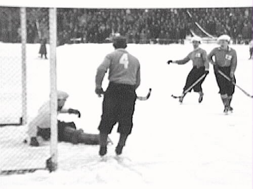 Bandy vid Stockholms stadion. Finland-Sverige. Mål på Finland.