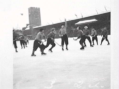 ÖSK bandylag lyckades vinna södergruppen 1951 med en poäng före Västerås SK och det betydde första SM-finalen för ÖSK. Bollnäs svarade för motståndet och matchen började bra för ÖSK:s del. Olle Sääw gjorde både 1-0 och 2-0, men hälsingarna gav inte tappt. Efter reducering till 1-2 kunde Henry Johansson kvittera till 2-2 på ett långskott och i slutskedet lyckades Per-Olof Andersson hitta rätt med ett skott som gav Bollnäs segern med 3-2. På bilden ser vi Tage Magnusson göra en handstoppning, vilket var tillåtet på den tiden. Han är ivrigt påpassad av hälsingeförsvaret där Snoddas Nordgren syns i vita mössan.Joje Gustafsson till vänster och Olle Sääw avvaktar Tages förehavanden.
