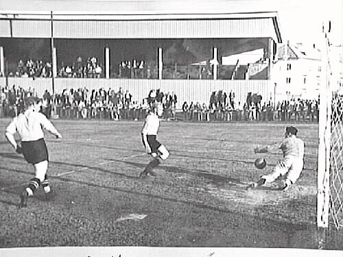 Oslo:s målvakt ensam mot ÖSK:s R.Larsson och L:Andersson.