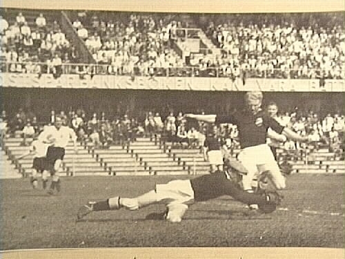 Målvakt Berndt Karlsson (ÖSK) räddar framför Arvis Karlsson (AIK) Stockholm.