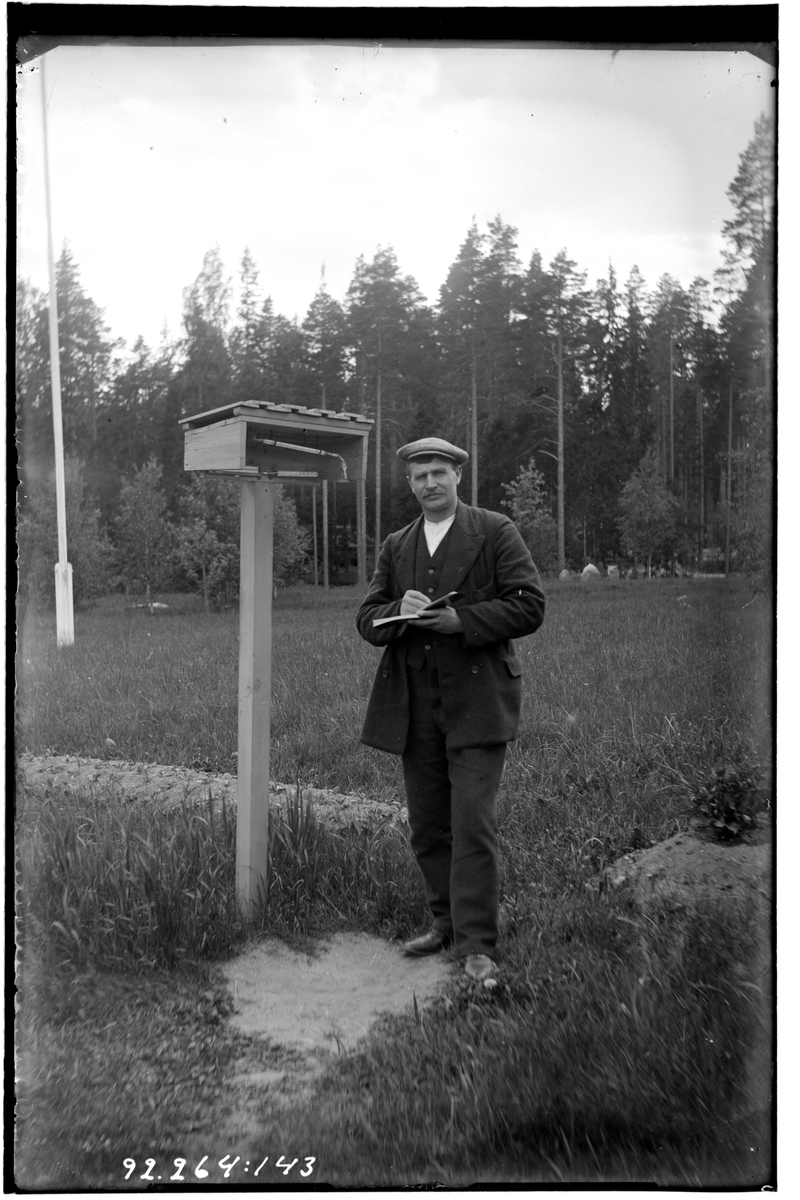 Hålahult sanatorium, exteriör, en man läser av temperatiren vid en väderstation.