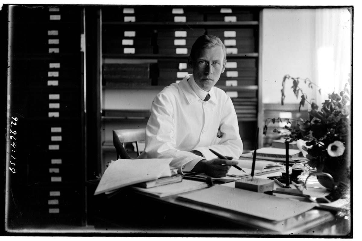 Hålahult sanatorium, interiör, underläkare E. Törnell 1/7 1918 - 7/10 1921 sitter vid ett skrivbord