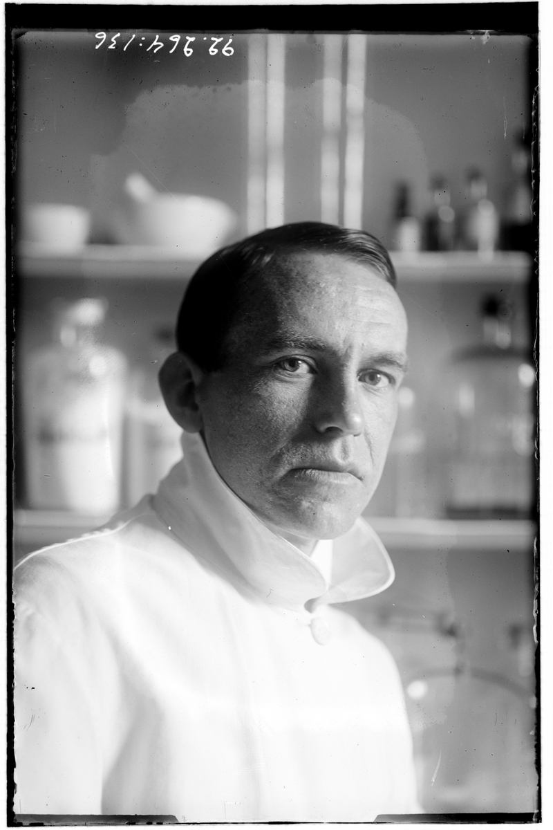 Hålahult sanatorium, interiör, labratoriemiljö, porträtt av en man