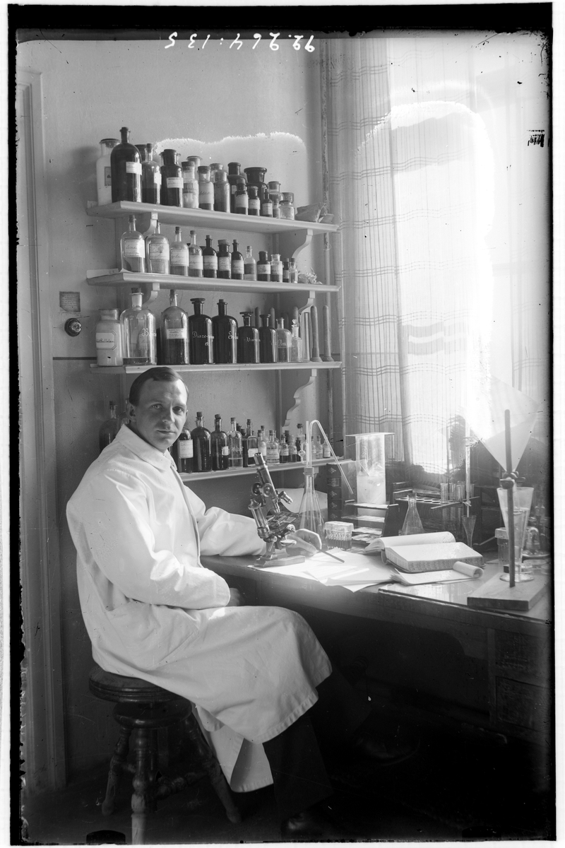 Hålahult sanatorium, interiör, labratoriemiljö? en man sitter vid ett mikroskop