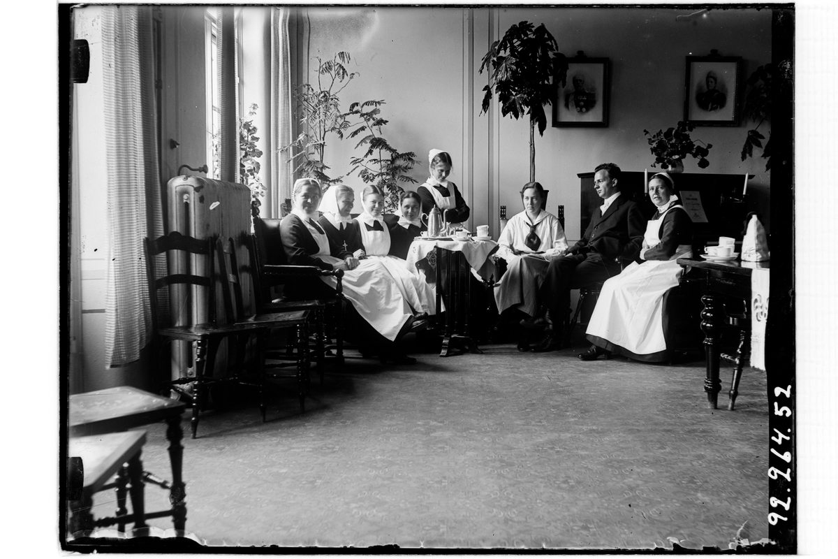 Hållahults sanatorium, interiör, gruppbild sitter runt ett litet bord vid ett piano, kaffekanna på bordet, nr tre från höger Betty Waller dr Wallers dotter.