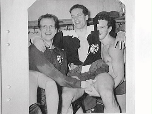 Örebro vann handbollsguldet. I seriefinalen i Ystad besegrade ÖSK Ystad med 20-16 och därmed var guldmedaljen klar.På bilden de tre hjältarna i Örebro. I mitten målvakten Roland Matsseon flankerad av Rune Åhrling och Rune Bruce.