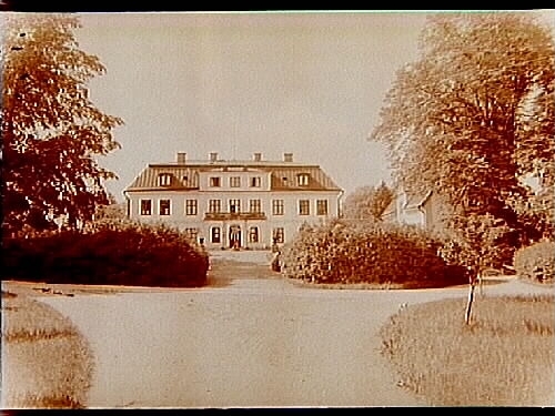 Frötuna Herrgård, tvåvånings herrgårdsbyggnad med frontespis och balkong, två takhuvar.