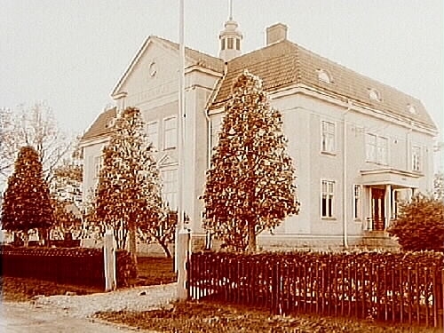 Tvåvånings tingshus med frontespis, brutet tak och veranda.