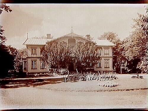 Nöbbeleds Herrgård i Värnamo, tvåvånings herrgårdsbyggnad med stor balkong och veranda i snickarglädje.