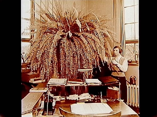 Titel: Gasverkets kontor, kontorsinteriör, en kvinna, jättestor ormbunke. Ingenjör Malmroth