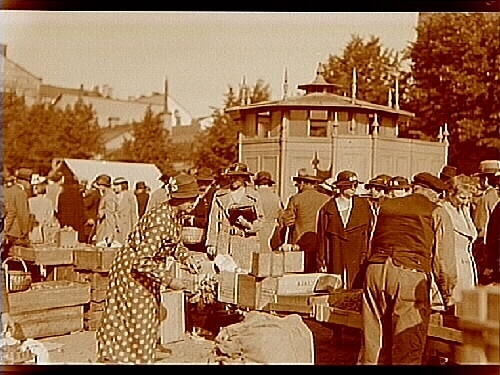Torghandel på Stortorget, torgstånd med handlare och kunder.