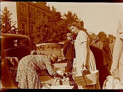Torghandel på Stortorget, torgstånd med handlare och kunder.