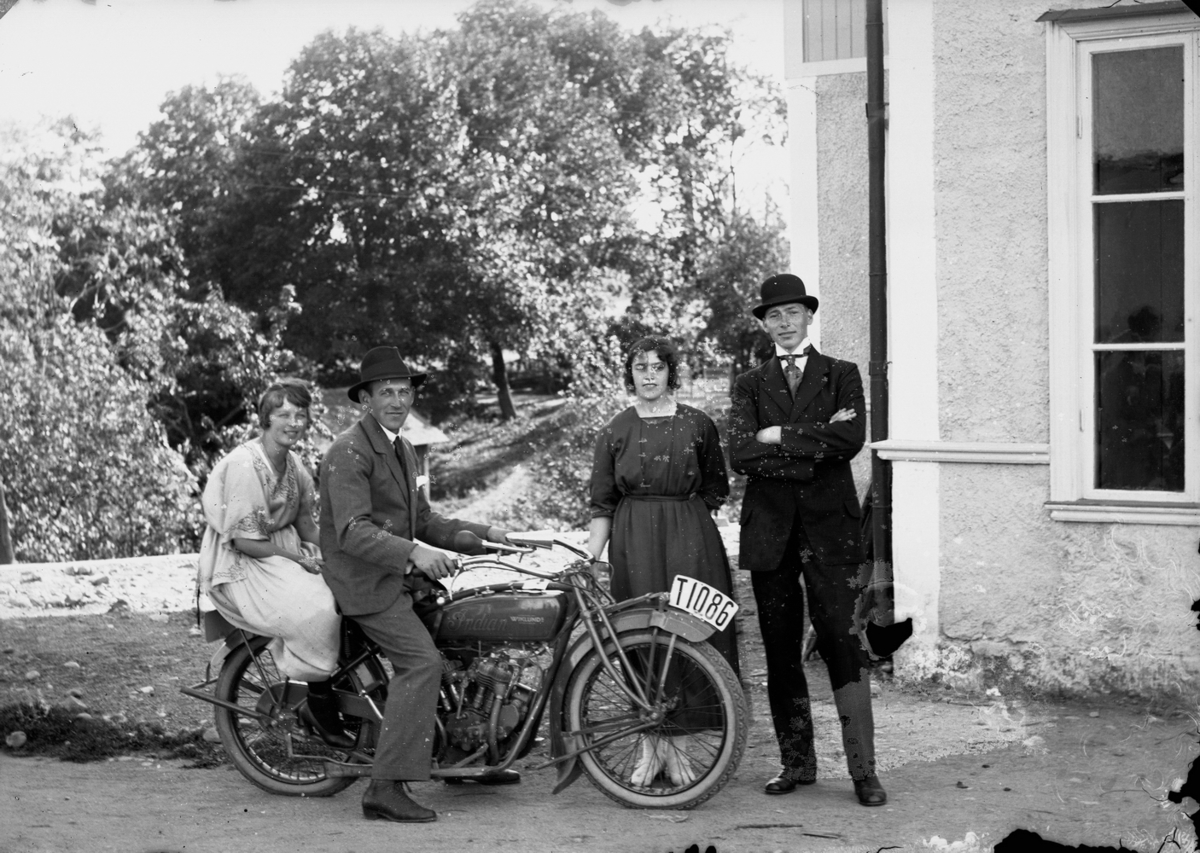 Fyra personer, två av dem på en motorcykel, utanför Nya Norra Hyddan i Svennevad.