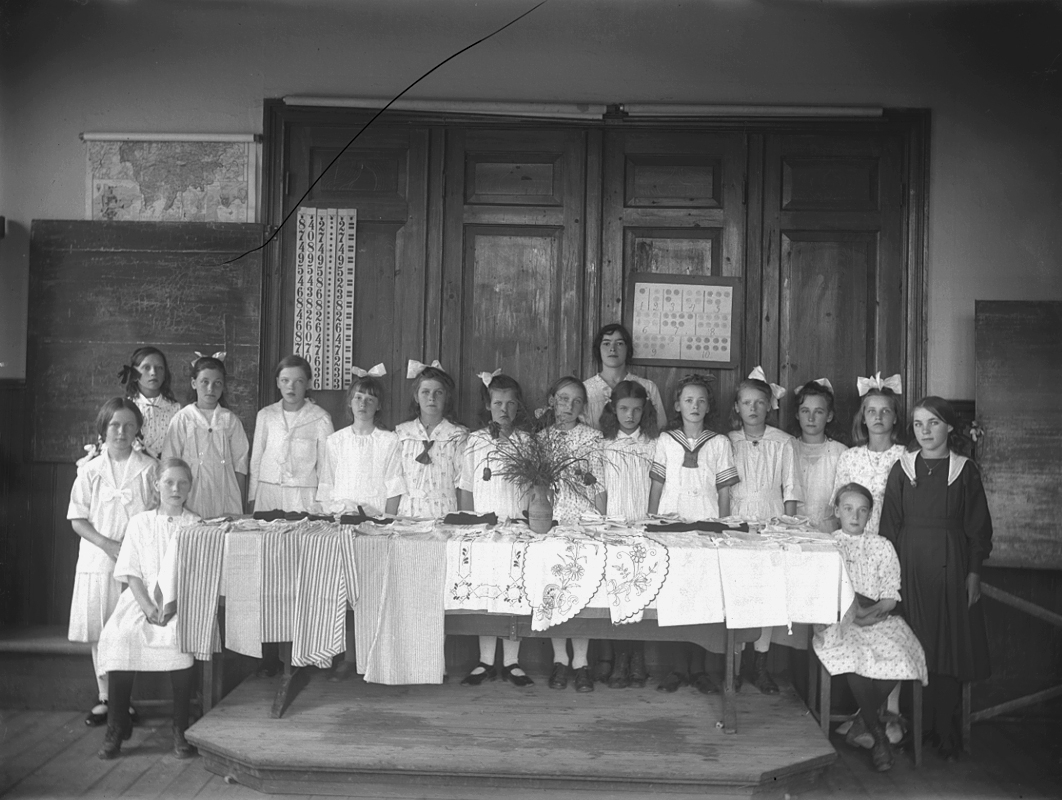 Klassrumsinterör, skolbarn med lärare, slöjd.