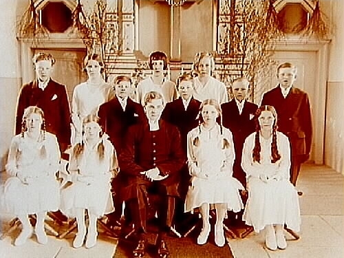 Konfirmander, 7 flickor, 5 pojkar och prästen framme vid koret i kyrkan.