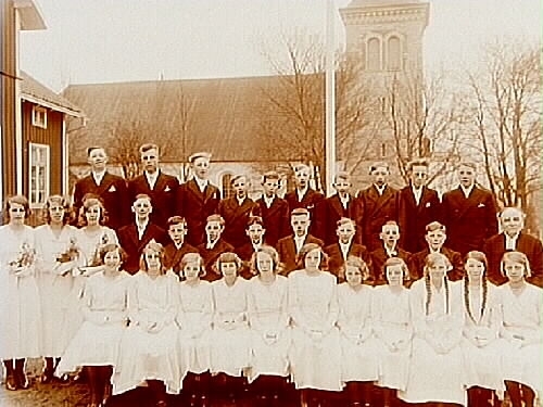 Konfirmander, 14 flickor, 18 pojkar och pastor Sjöström.
