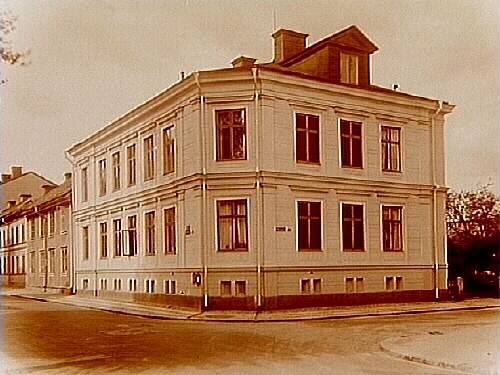 Tvåvånings bostadshus, hörnfastigheten Alnängsgatan och Olaigatan.