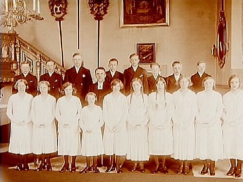 Konfirmander, 10 flickor, 8 pojkar och prästen.