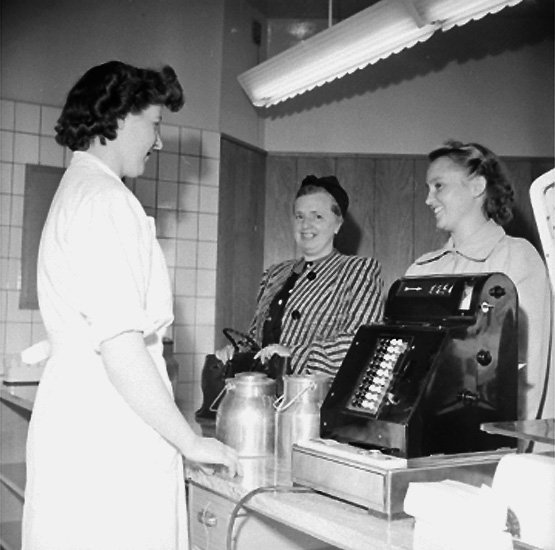 Konsum, affärsinteriör, kunder och personal.