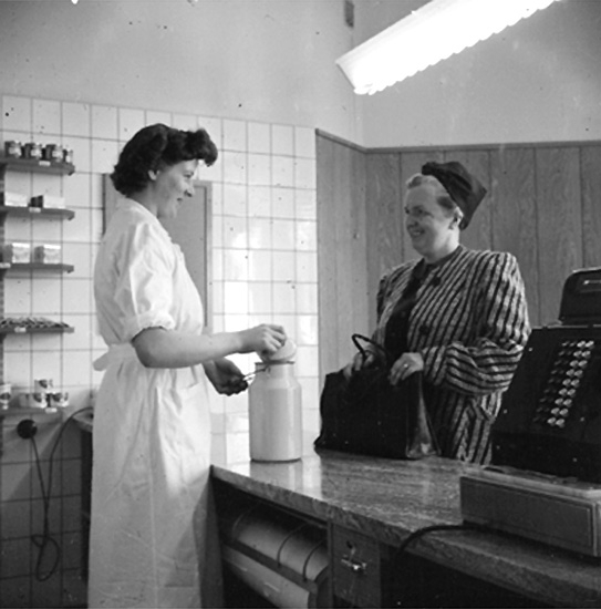 Konsum, affärsinteriör, kunder och personal.