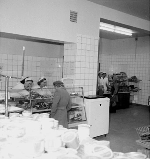 Konsum, affärsinteriör, kunder och personal.