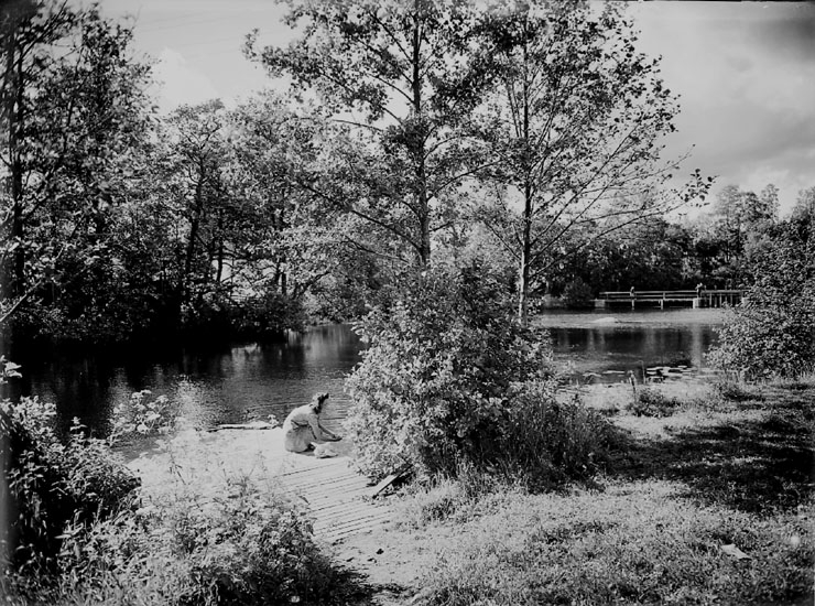 Tvättning, klappbryggan och dammen, en flicka på bryggan.