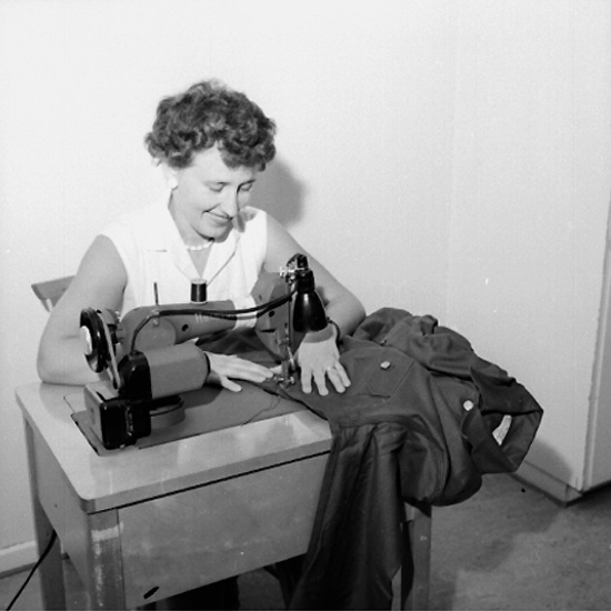 Titel: Interiör, en kvinna vid symaskinen. "Ulla lagar blåställ". Beställare: Sedells Reklam.