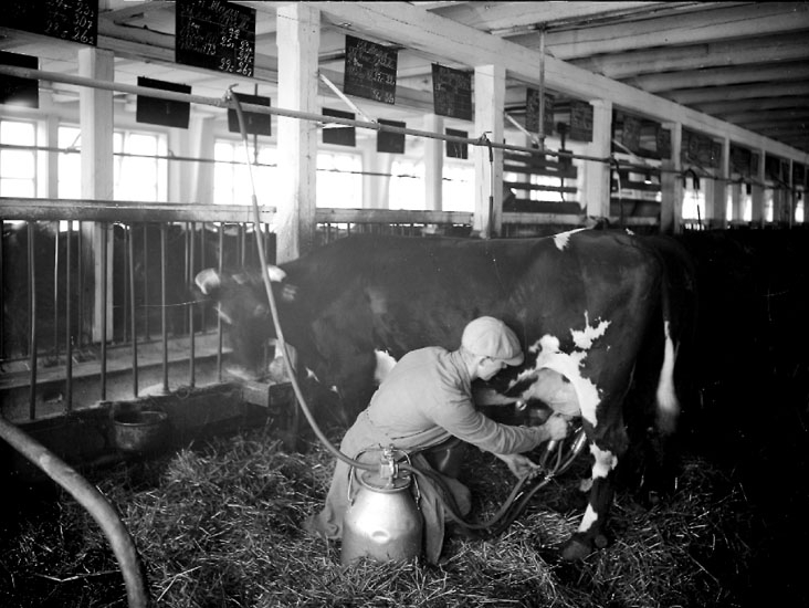 Mjölkning av kor med mjölkningsmaskin, en man.