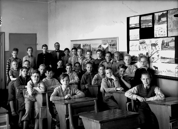 Vasaskolan, klassrumsinteriör, 27 pojkar med lärare Bertil Berglund.