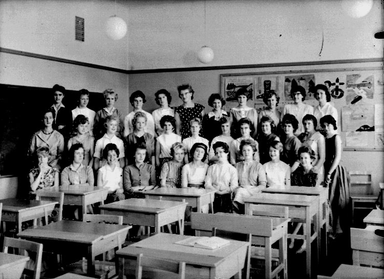 Klassrumsinteriör, 32 flickor med lärarinna.