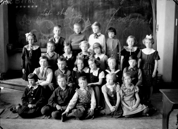 Engelbrektsskolan, klassrumsinteriör, 22 skolbarn med lärarinna Elly Söderlund.