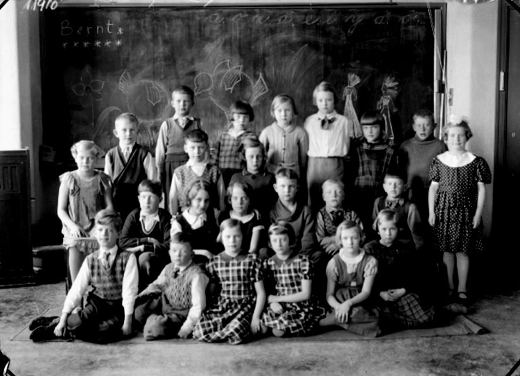Engelbrektsskolan, klassrumsinteriör, 23 skolbarn med lärarinna fru Elly Söderlund.
