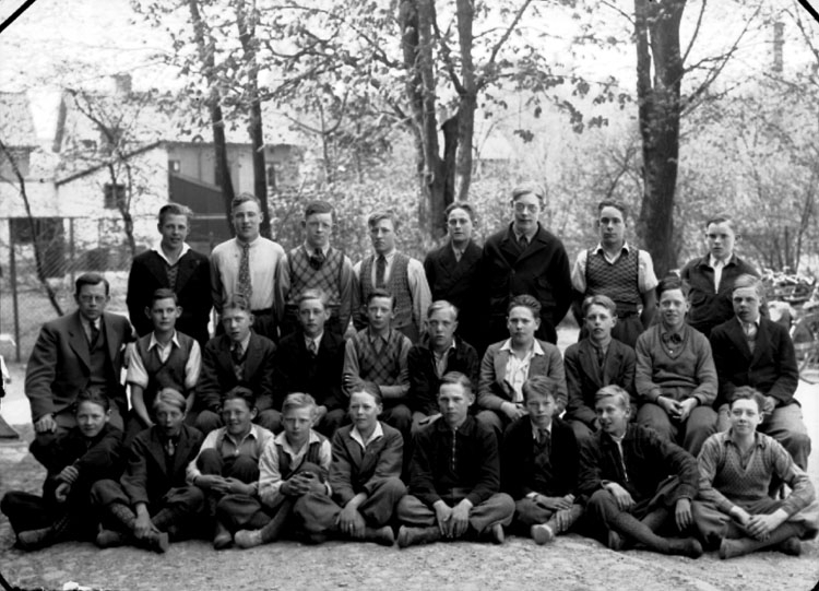 Nikolaiskolan, 26 pojkar med lärare Lagerlöf på skolgården.