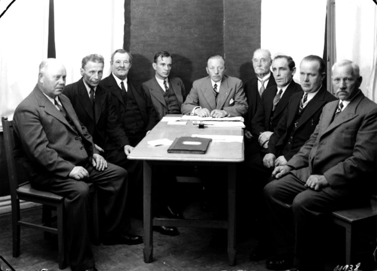 Längbro Pensionsnämnd, interiör, nio herrar runt bordet.