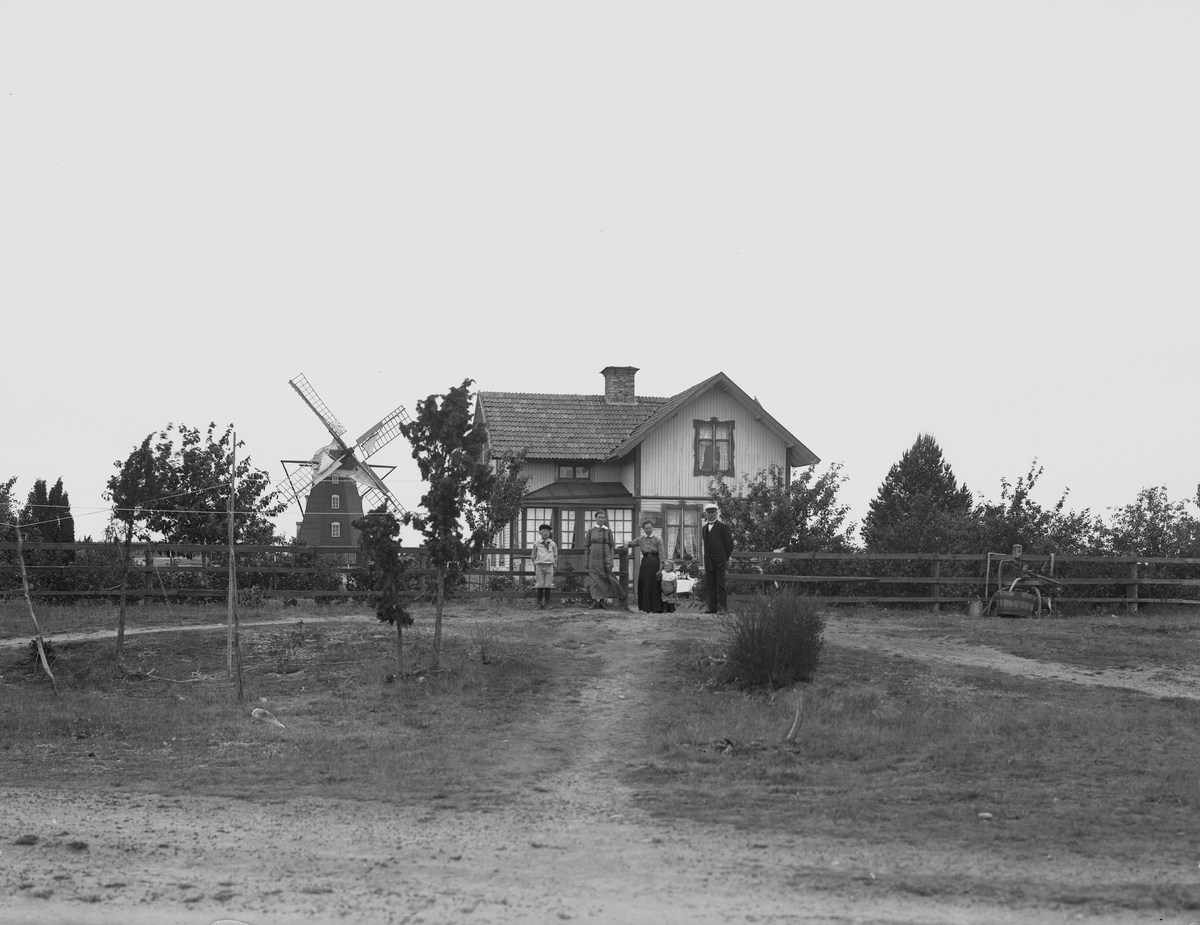 En och en halvvånings vinkelbyggt bostadshus med glasad veranda. Sex personer framför huset.