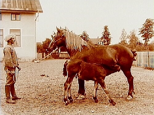 Märr med föl, en man.
