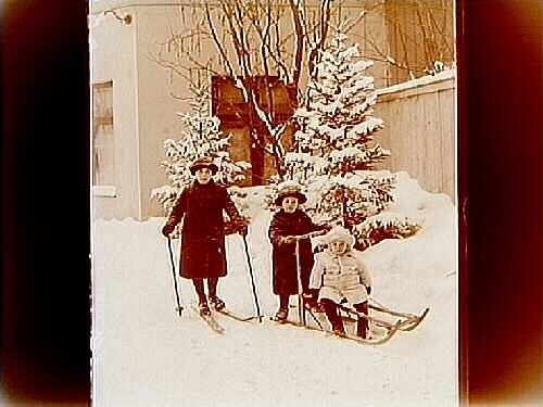 Märta Lindskog på skidor, Margit skjutsar sin bror Karl Erik på spark.