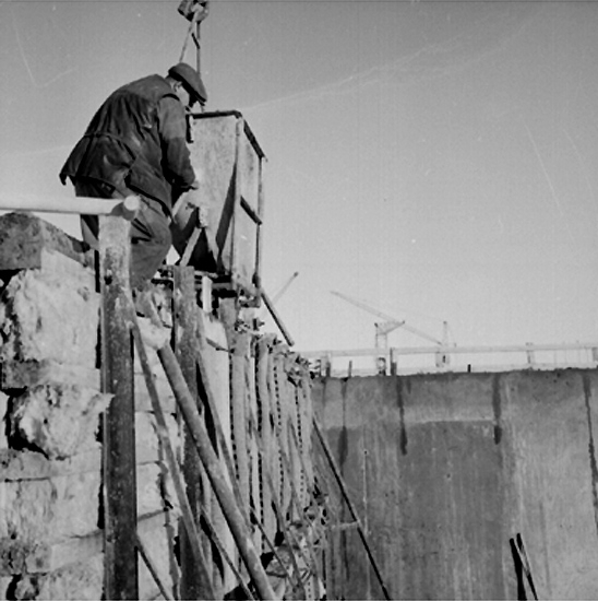 Byggnadsarbete, en man. Gjutning av väggform med betongbask.