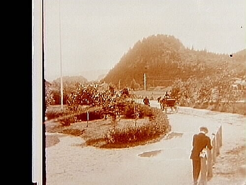Landsväg med en hästskjuts, två personer på vägen . Ett berg i bakgrunden.