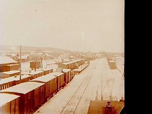 Titel: Järnvägsstation i Jämtland (?) eller Ånge (?). Rangerbangård, godsvagnar och öppna vagnar. Stereofotografi.