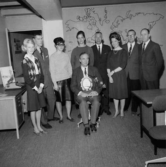 Wigrell & Co, kontorsinteriör, grupp nio personer. Prisutdelning.