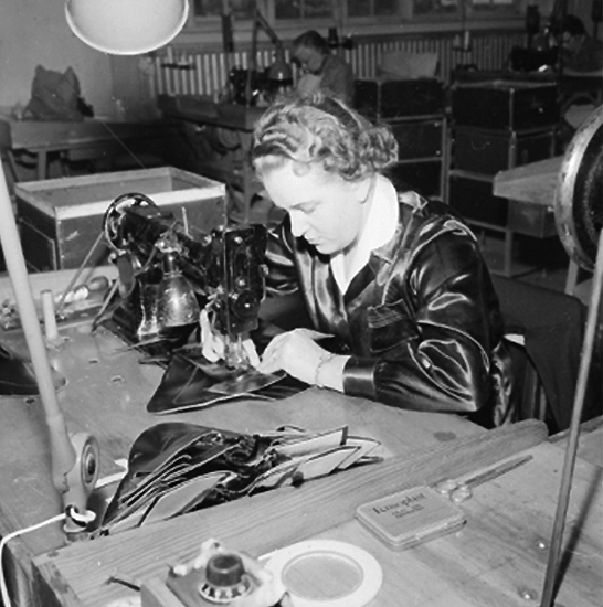 Oscaria Skofabrik, interiör, skotillverkning, en kvinna vid symaskinen.