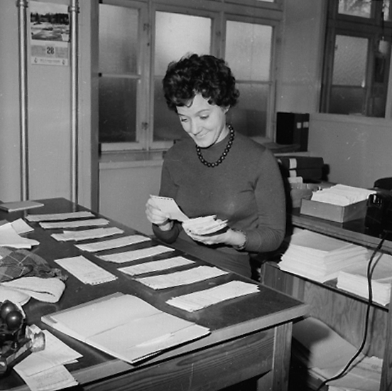 Oscaria, strumpcentralen, interiör, en kvinna.