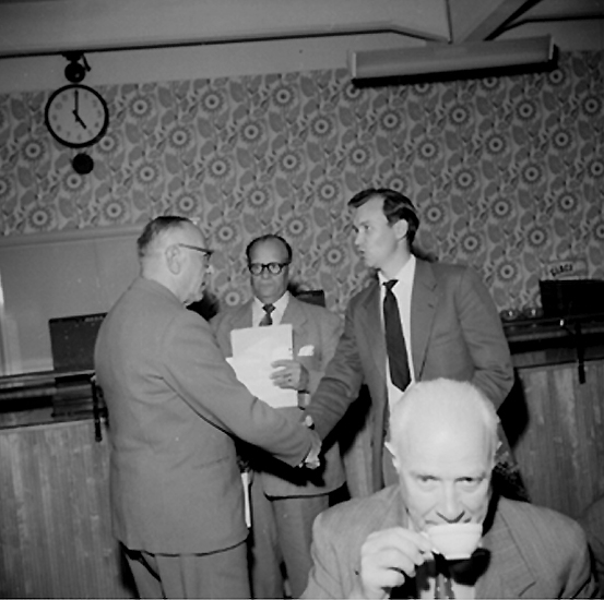 Rumsinteriör, grupp, Oscarias pensionärer. Avtackning.