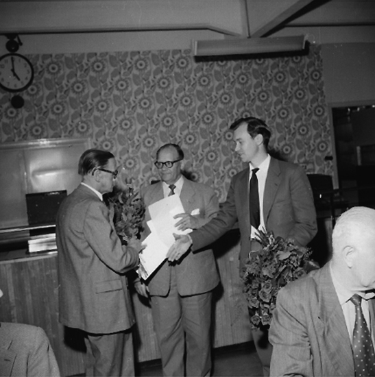 Rumsinteriör, grupp, Oscarias pensionärer. Avtackning.