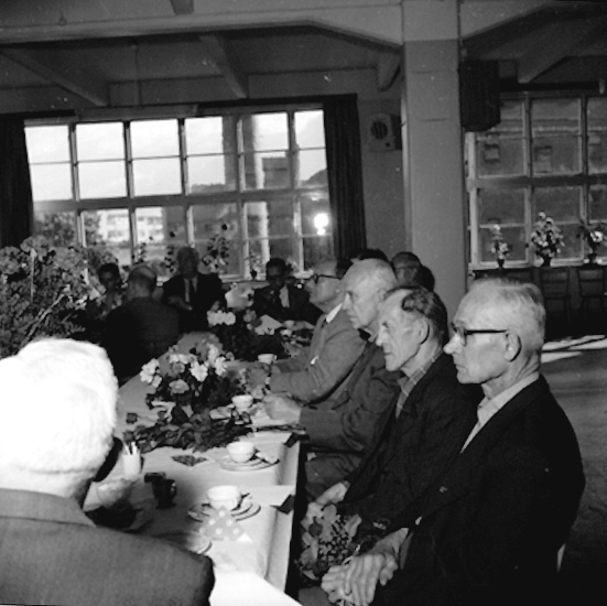Rumsinteriör, grupp vid bordet, Oscarias pensionärer. Avtackning.