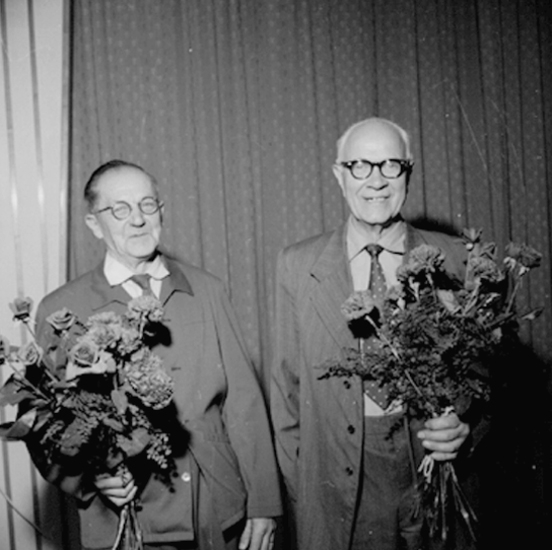 Rumsinteriör, två män, Oscarias pensionärer. Avtackning.