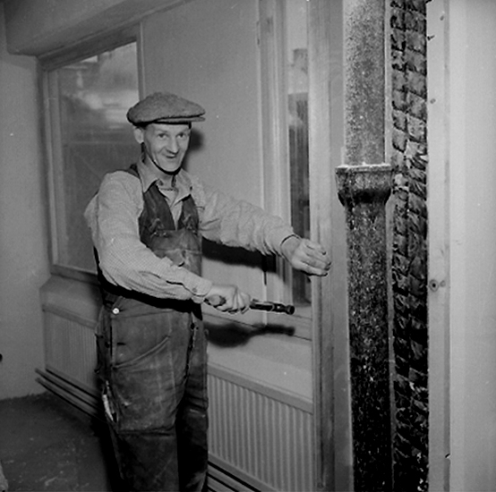 Titel: Byggnadsarbete, interiör, en man. Oscaria (beställare ?).