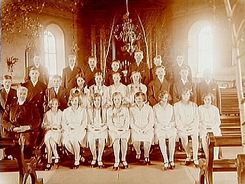 Konfirmander, 12 flickor, 13 pojkar och kyrkoherde Nilsson.